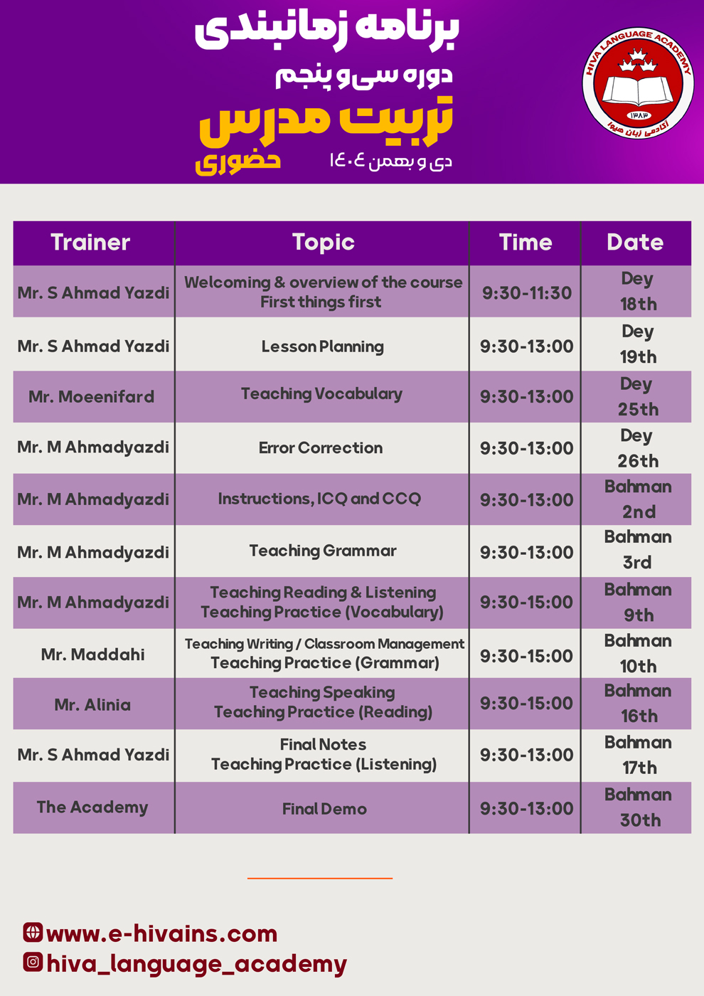 سی و پنجمین دوره تربیت مدرس زبان انگلیسی آکادمی زبان هیوا در تاریخ هجدهم دی آغازخواهد شد و به مدت پنجاه ساعت در چهارده جلسه ادامه خواهد یافت.